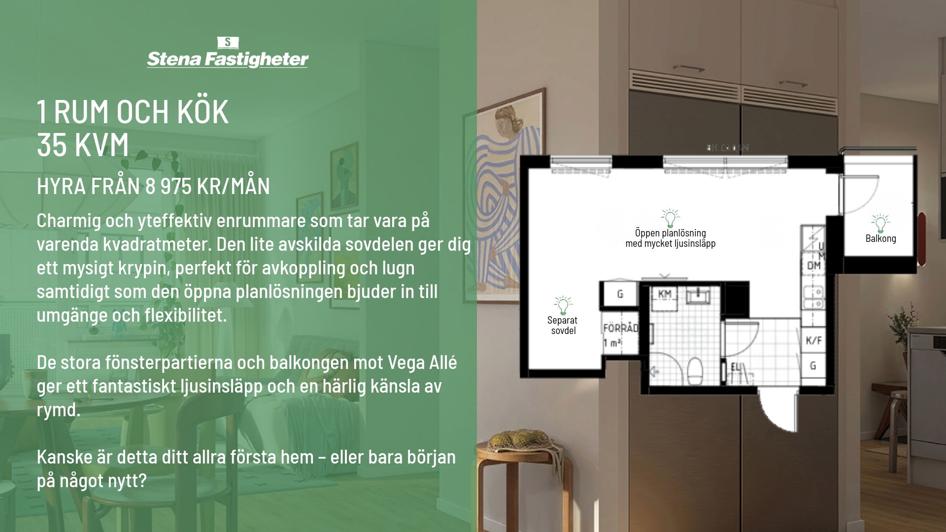 Endast 20 minuter från citybruset har en ny stadsdel vuxit fram, där det hållbara livet står i centrum. Här bor du nära naturen för lek och lugn, nära varandra för gemenskap och nära service som förenklar vardagen. Vega är både modernt och omtänksamt – ett tryggt, praktiskt och hemtrevligt liv för livets alla skeden.