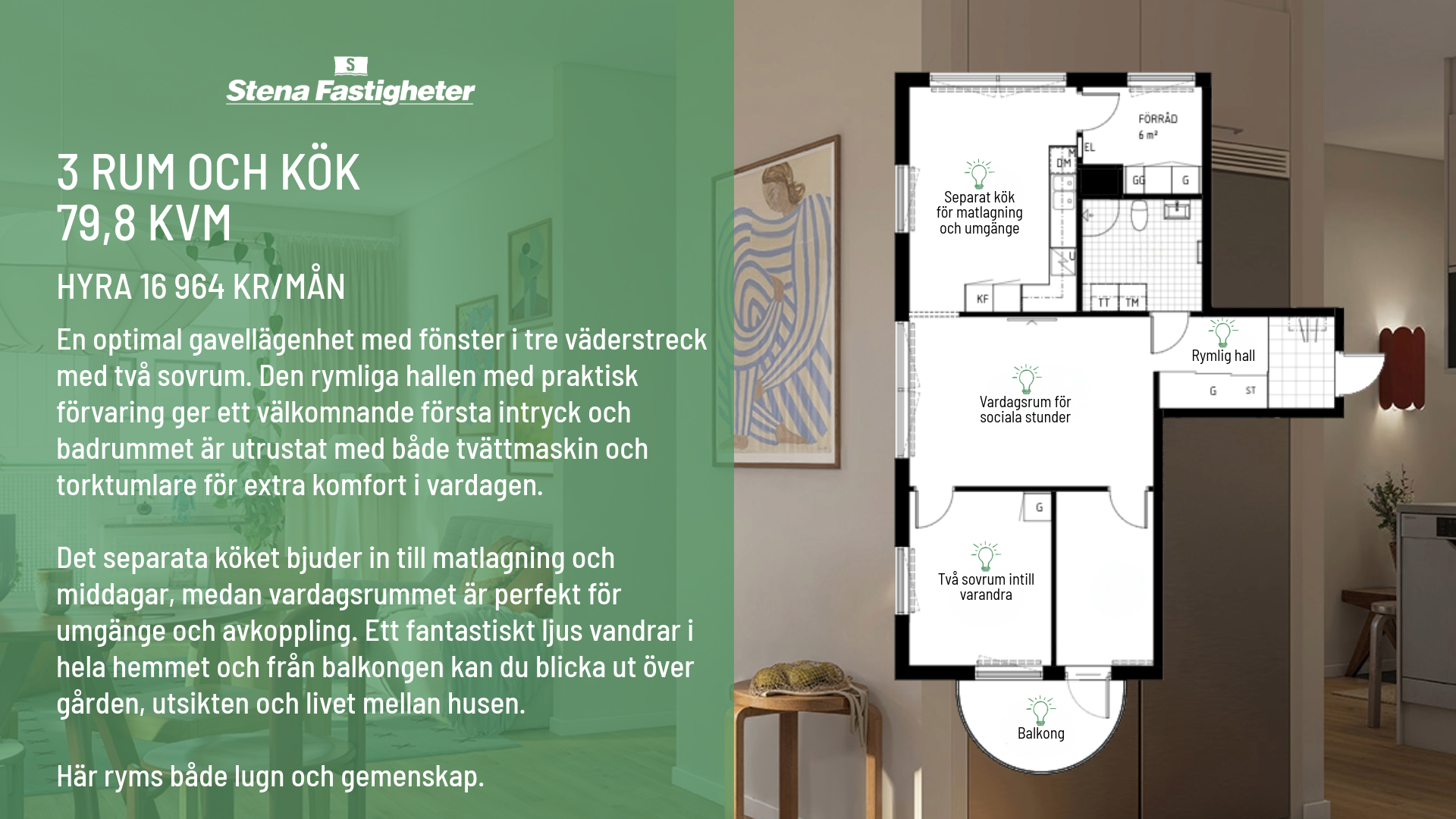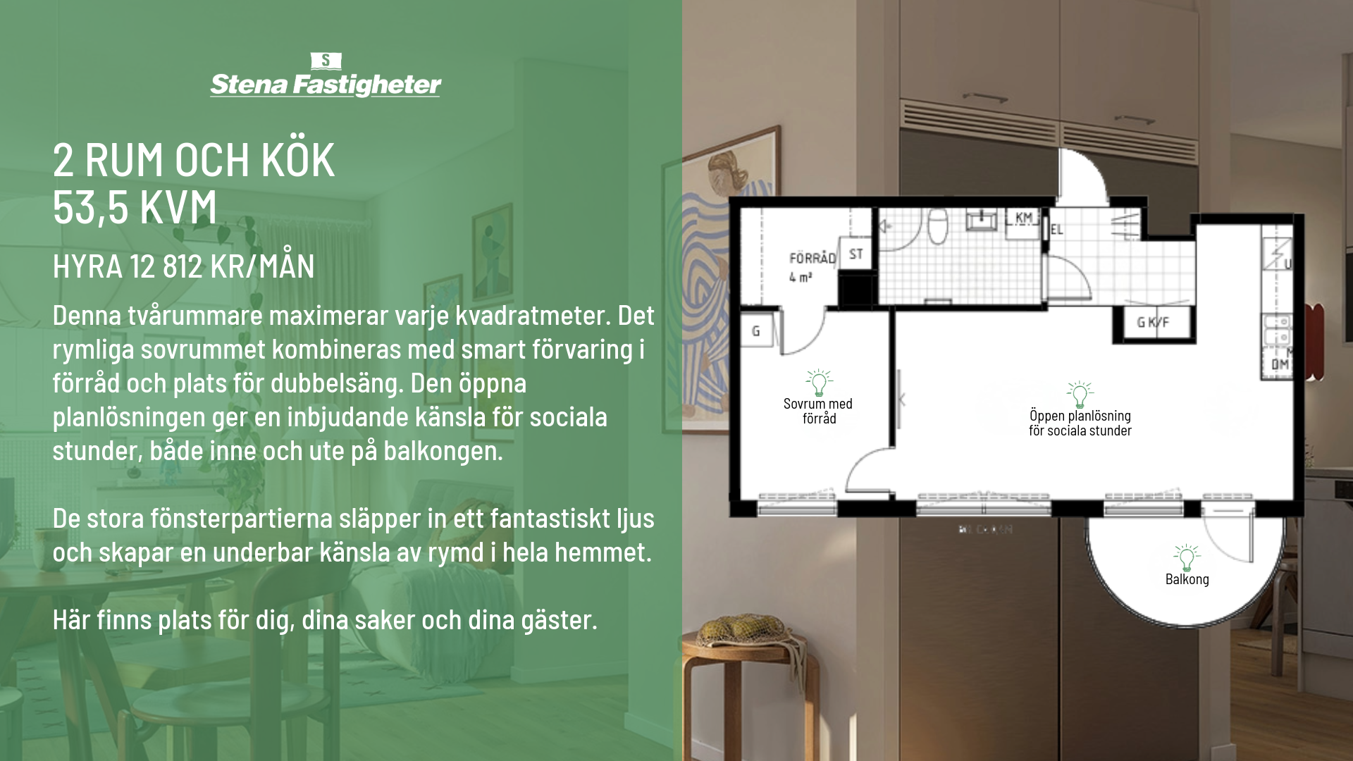 Kvarteret Stella består av 82 tidlösa hyresrätter med det där lilla extra, Lägenheterna varierar mellan 1 till 5 ROK om 35 - 105 kvm. Oavsett om du letar efter en mysig etta, en smart tvåa eller en större lägenhet med rum för fler så finns här lägenheten för dig.